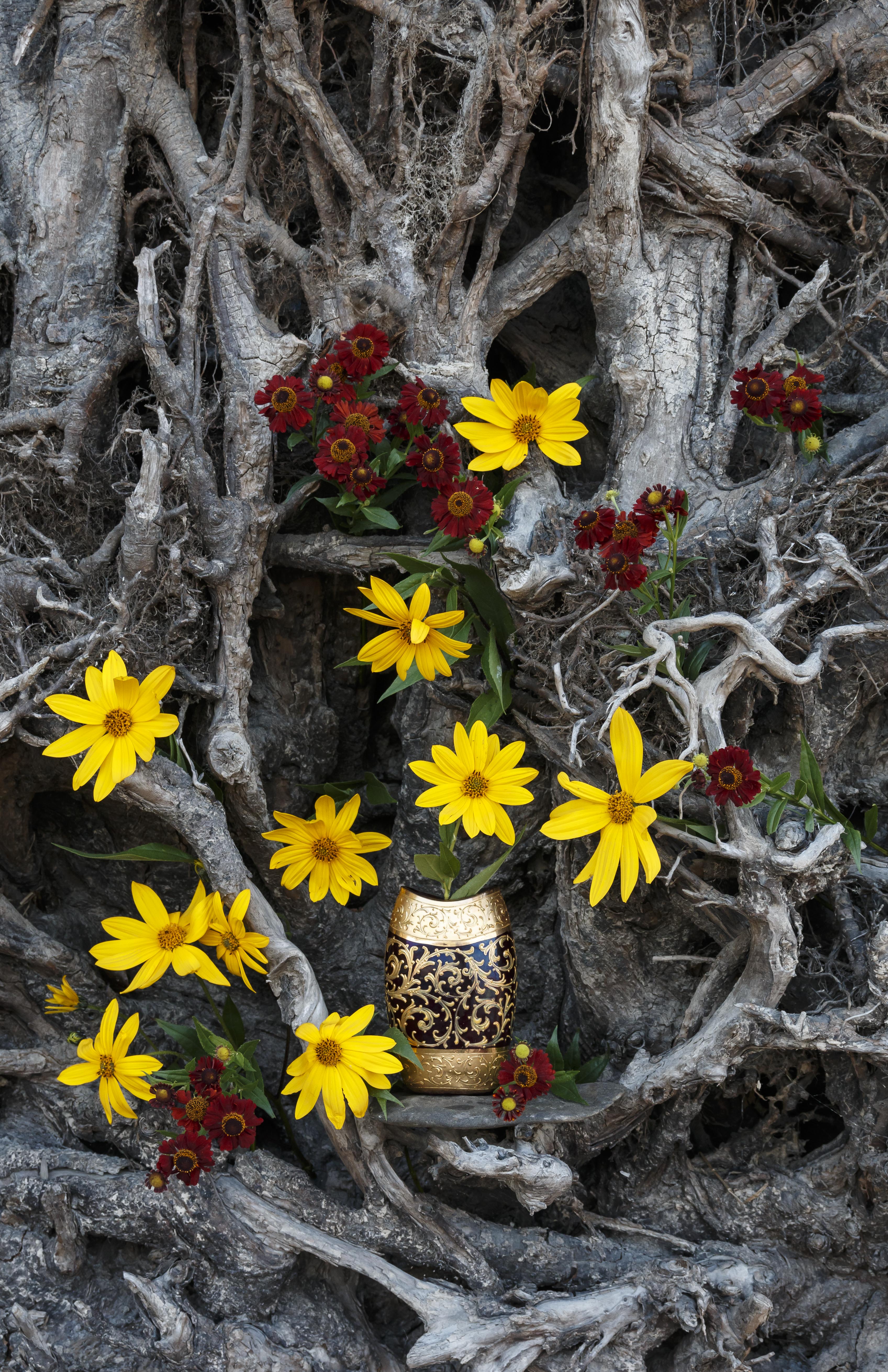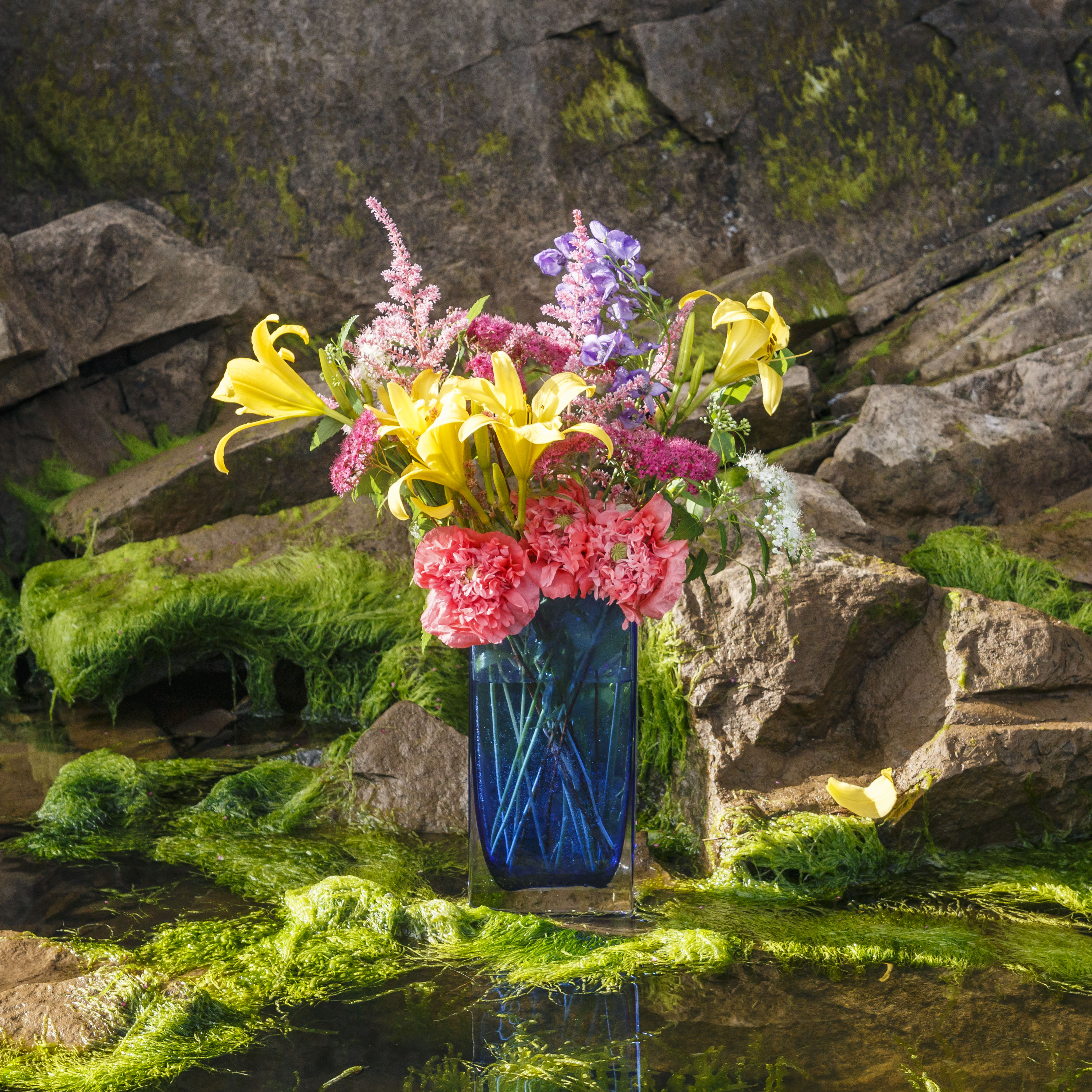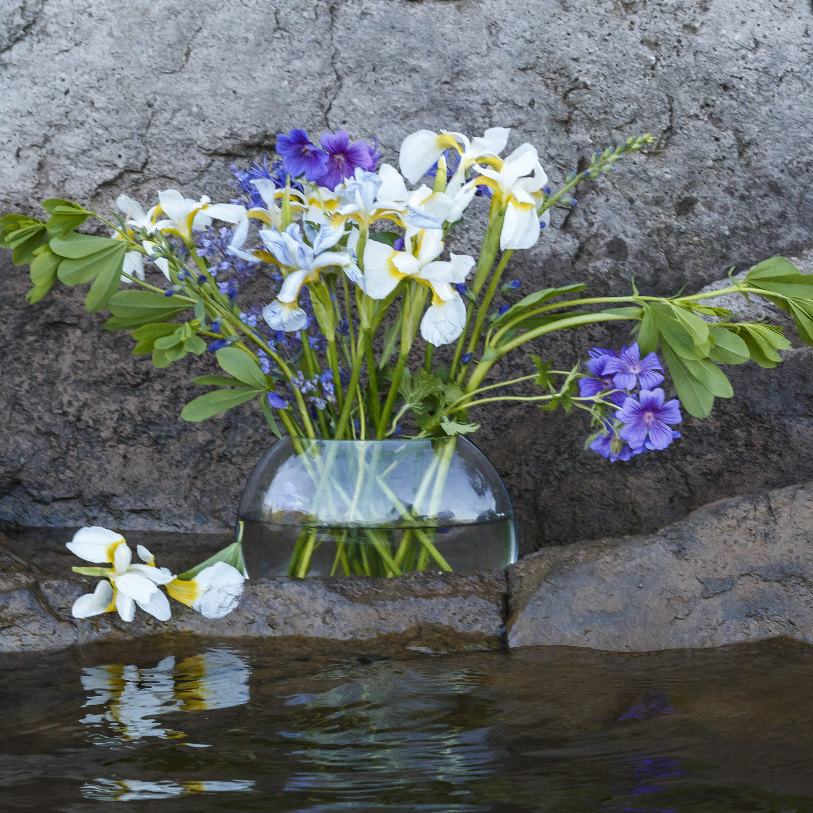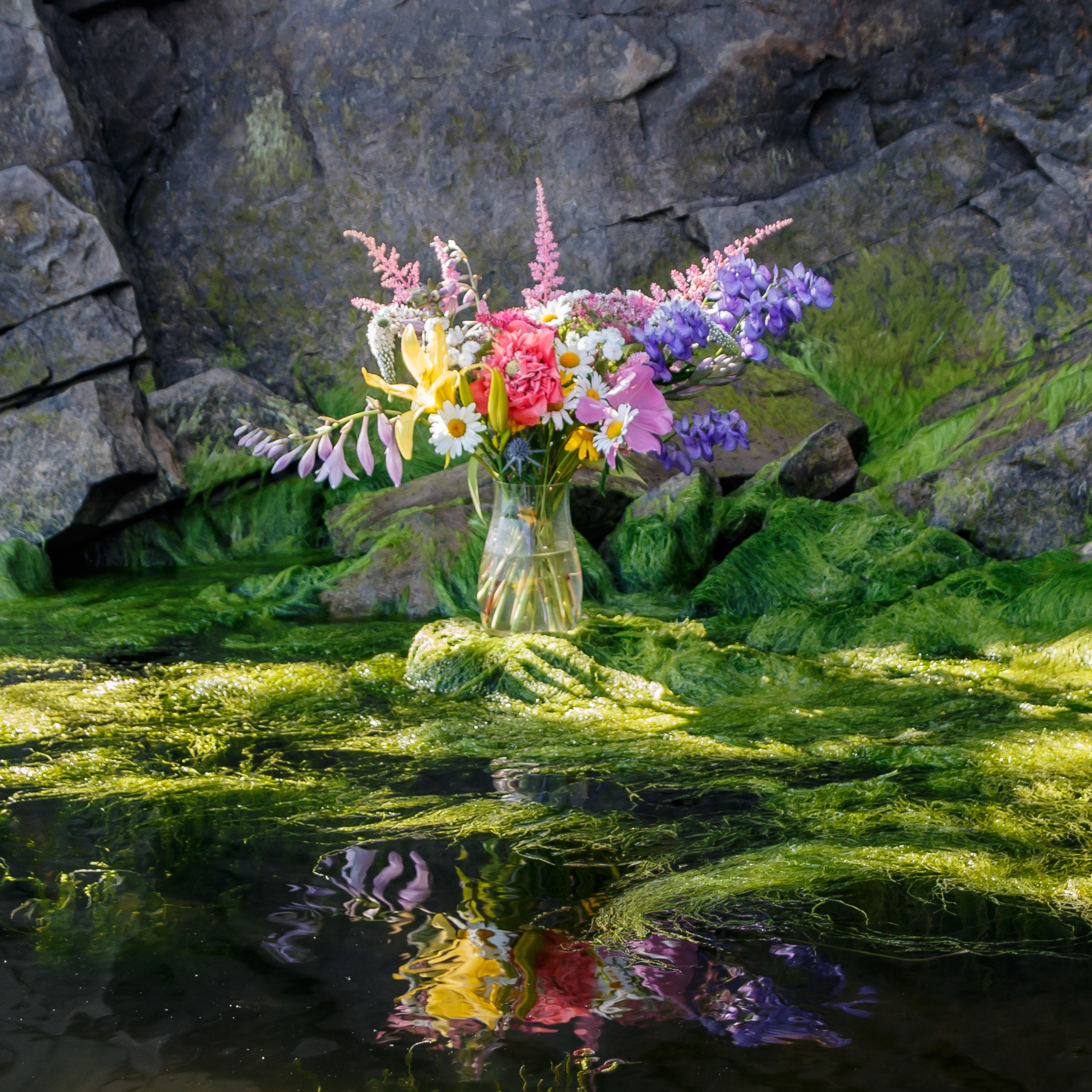 During the summer months, Liane takes floral arrangements created with flowers from her garden out with her on her morning paddles, placing them in various rocky outcroppings she finds along the cove. She enjoys the challenge of finding interesting locations and balancing the flower vases on the rocks, without tipping the vase of flowers or the kayak, or dropping her camera in the water. She finds the contrast between the stark rock, the vivid green seaweed and the colourful flowers appeals to her love of colour.