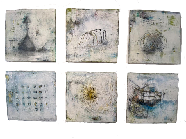 Challenging myself with new materials has always been forefront in my art practise, so I consider myself more of a process painter. I love trying new things. These particular pieces are part of a series I did last summer and my first foray into cold wax and oil. I've used oil for years so this new addition was exciting. Unlike encaustic, there is no application of heat in cold wax and oil. Using cold wax and other mediums such as galkyd gel, allows the oil paint to dry faster and gives it a more impasto quality. I also use oil sticks and oil bars. All of these materials allow the surface to be scraped-into or sanded or texturized by pressing various things into it. It can have a transparent or an opaque nature depending on the application. These particular pieces were layered and sanded and scratched and scraped. The images are memories, pared down, of shapes that are common to the place I live...harbour markers, vertebrae of sea creatures, tangles of fishing lines and ropes, lobster traps, the fog and then the brilliant sunshine mirrored by the sea, and the vessels. The tactility and sculptural quality of this medium lends itself to being worked. I also use graphite powder and then the final step is to buff the surface to a lovely soft satin patina. They are particularly lovely to feel. The other pieces in this series were larger and formed a grid of smaller images much like these. Cold wax and oil is generally applied to a solid surface such as cradled wood in order to give it the strength to be worked heavily. Looking closely one can see the physicality of the piece while the softness of the wax process remains.